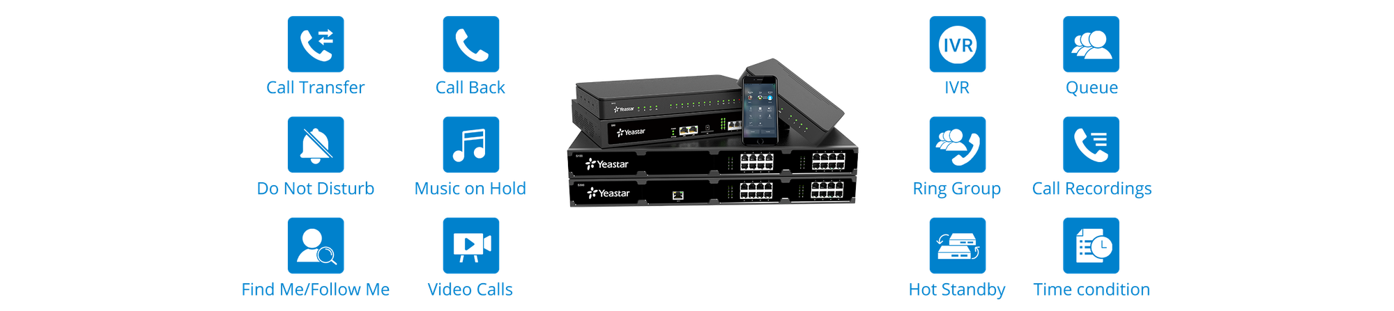 תכונות משולבות במלואן : החל ניתוב שיחות בסיסי, IVR ועד שיחות ועידה והקלטה מתקדמות, מרכזיית VoIP מסדרת S של Yeastar מספקת לך תכונות מקיפות ללא דמי רישוי נוספים.